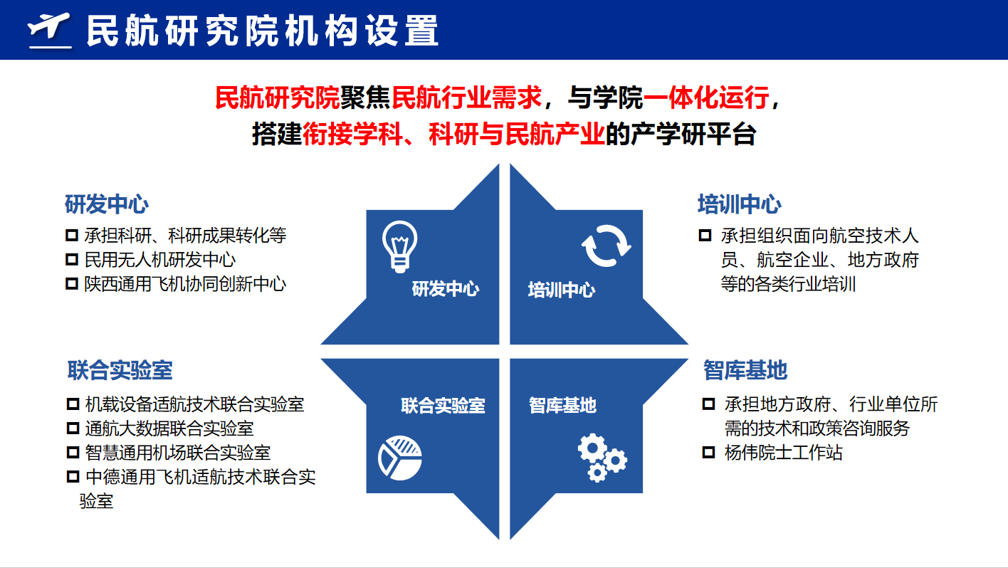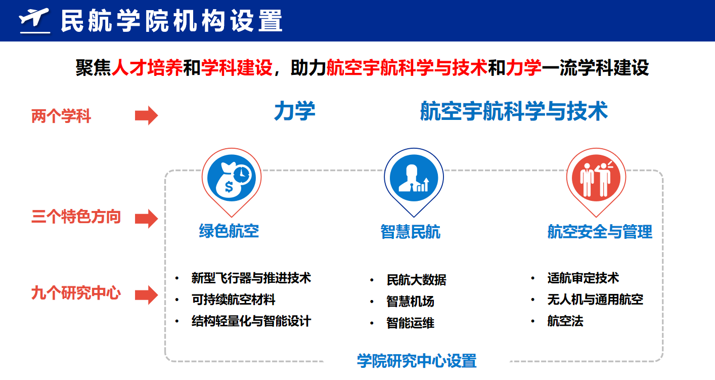 德州牛仔游戏 聚焦人才培养和学科建设,与研究院一体化运行,以绿色航空、智慧民航、航空安全与管理三大特色方向为引领,着重打造九大研究中心,助力航空宇航科学与技术和力学学科建设。民航研究院聚焦民航行业需求,与德州牛仔游戏 一体化运行,搭建衔接学科、科研与民航产业的产学研平台。