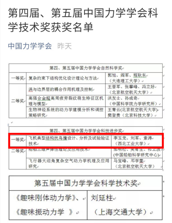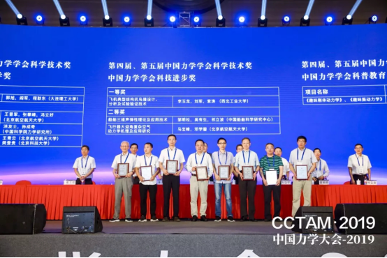 8月26日“中国力学大会-2019”开幕式上,举行了第四届、第五届中国力学学会科学技术奖颁奖仪式。西北工业大学李玉龙、刘军、索涛三位教授的“飞机典型结构抗鸟撞设计、分析及试验验证技术”项目荣获第四届、第五届中国力学学会科技进步奖一等奖。