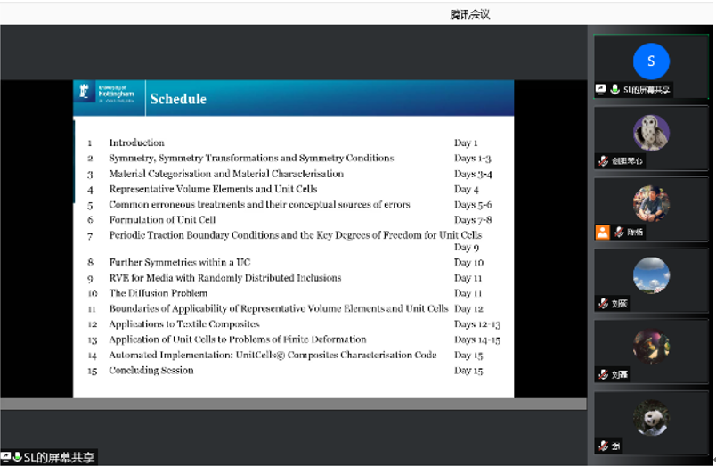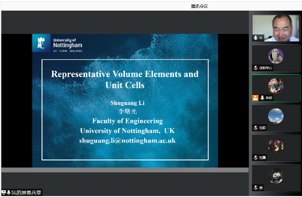 张超教授邀请,英国诺丁汉大学李曙光教授于2021年8月5日至25日开展了题为“Representative Volume Element and Unit Cells”的暑期线上专题班。本次课程的组织依托结构力学行为科学与技术创新引智基地、冲击动力学及其工程应用国际联合研究中心和陕西省冲击动力学及其工程应用重点实验室等科研平台举办,来自西北工业大学、哈尔滨工业大学、中国商飞等30余高校、企业和科研院所的200余名老师、学生和科技工作者参加了本次课程。