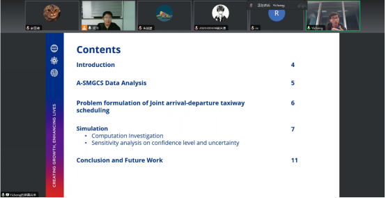 讲座中,张逸成博士向与会的师生简要介绍了在新加坡求学和工作的经历,结合他本人在罗罗-南洋理工大学联合实验室及新加坡科技研究所的研究工作,以新加坡樟宜国际机场的调度为例,重点介绍考虑起飞不确定性的联合调度问题,以及近期在该领域理论建模及联合仿真中的突破和进展。张逸成博士对新加坡樟宜机场A-SMGCS数据集进行数据分析,验证了离港不确定性的存在;提出了一种考虑起飞不确定性的起降飞机随机优化模型;利用大数据方法和Chebyshebv不等式将模型转化为混合整数二次规划问题;并最终通过仿真对上述方法进行验证。