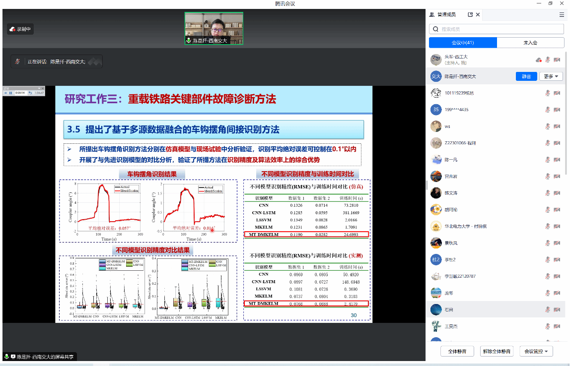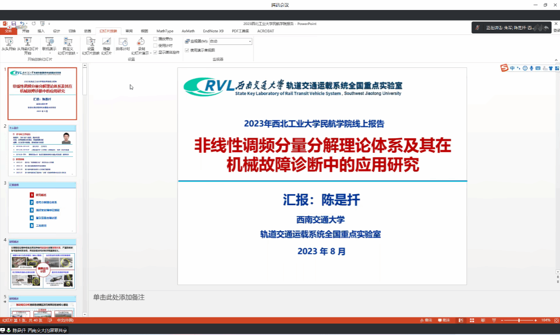 在本次研讨会中,陈是扦首先介绍了机械装备故障诊断的意义,然后从三个方面:非线性调频分量分解理论体系、复杂强时变故障特征精细提取方法、重载铁路关键部件故障诊断方法,介绍了其团队在这三个方面的工作。