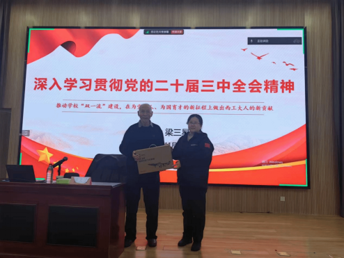 专题党课在师生们的热烈掌声中结束,光电与智能研究院党总支书记訾方代表活动组织方向梁三星教授赠送纪念品。