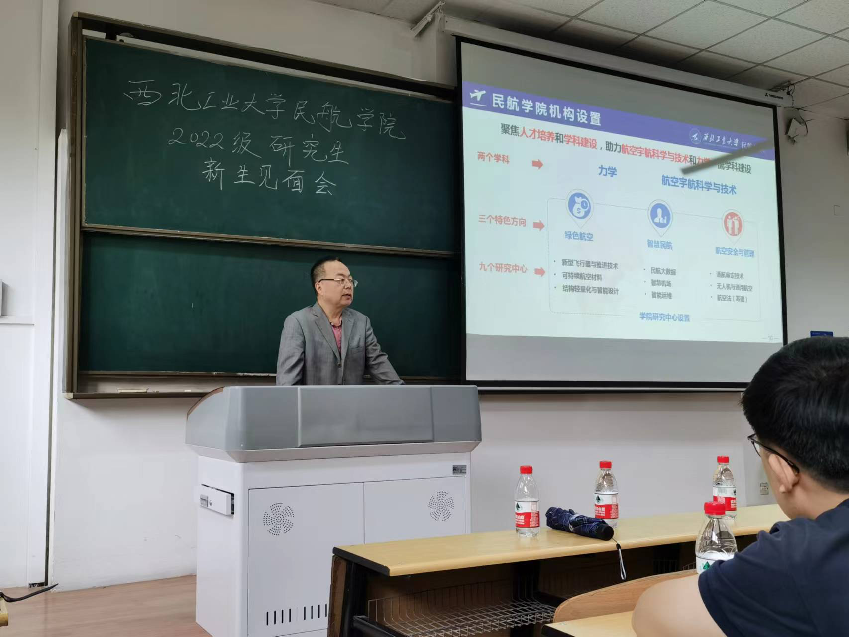 向2022级研究生新生表示热烈欢迎,并以“不负韶华 勇于追梦”为主题,为全体新生讲授了研究生生涯的第一堂思政课。他向同学们讲述了西工大“脉源三支,强强融合”的历史沿革,带领同学们学习校史,并结合校训、校风和当代民航精神等,向同学们提出了“努力成为堪当民族复兴重任的时代新人”的希望。