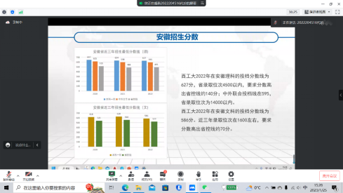 第一次宣讲会在1月25日下午,线上进行。参加宣讲的学生大多是高三生。在宣讲中,实践组员向学生展示了准备好的数据统计图,帮助他们了解历年招生情况,并鼓励他们在高三最后的冲刺期间努力学习,取得好成绩。一些学生表达了想要报考西工大的意愿和想要航空报国的梦想,实践队员传授了自己的高考经验,回答了他们的问题。