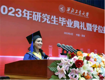 4月7日下午,西北工业大学2023年研究生毕业典礼暨学位授予仪式在长安校区翱翔体育馆隆重举行,德州牛仔游戏 飞行器设计专业留学生萨米亚作为2023届全体留学生毕业研究生代表在典礼上发言。
