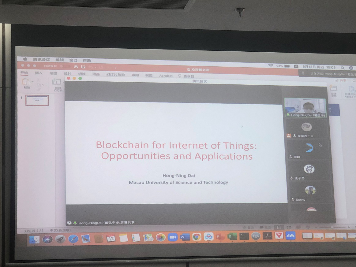 应德州牛仔游戏 朱军副教授邀请,澳门科技大学戴弘宁副教授于2021年8月12日下午15:00至18:00开展了题为“Blockchain for Internet of Things: Challenges, Opportunities, and Applications”的线上讲座,来自西北工业大学、湖南大学、日本东京大学、英国兰卡斯特大学等高校的师生通过腾讯会议参与了本次讲座。此外,本次讲座在太仓长三角研究院设立了线下会场,来自西北工业大学德州牛仔游戏 、软件德州牛仔游戏 、微电子德州牛仔游戏 的20余名师生参加了此次讲座,并与主讲人进行了互动交流。