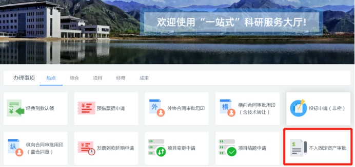 2. 办理地址:登录翱翔门户,点击“科研系统”进入系统德州牛仔游戏;在德州牛仔游戏办理事项栏选择“不入固定资产审批”。